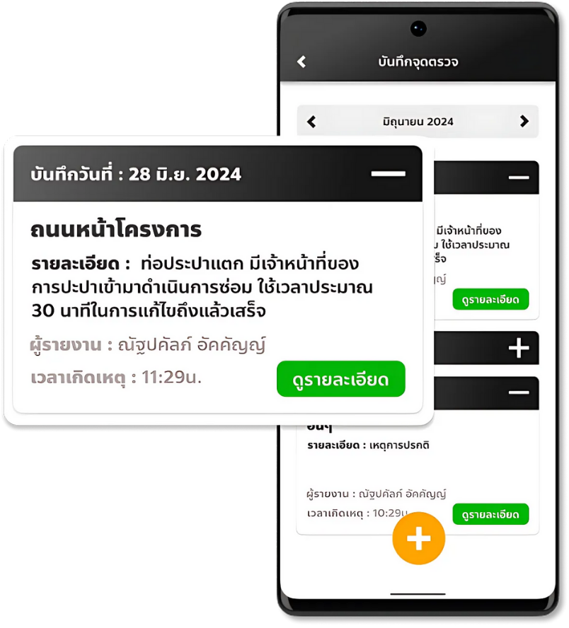 เขียนรายงานประจำวัน (รองรับการพิมพ์ด้วยเสียง) พร้อมแนบรูปถ่ายประกอบการรายงานได้หลายรูปรวมถึงสามารถแยกประเภทของรายงานได้
