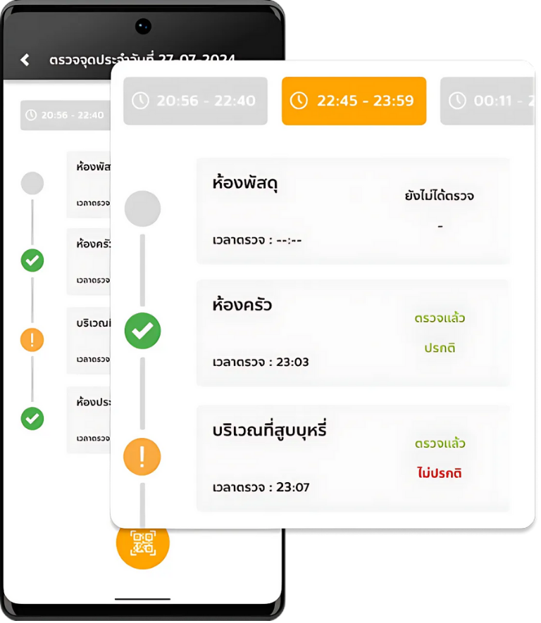 เดินตรวจจุด QR CODE ตามรอบเวลาที่ส่วนกลาง กำหนดให้ มีการถ่ายภาพทุกจุด สามารถกดข้ามจุด ในกรณีฉุกเฉินพร้อมอธิบายเหตุผลในการข้ามจุดส่วนกลางยังสามารถสร้างรอบเดินตรวจและสร้างจุดตรวจได้อย่างไม่จำกัด รวมถึงการแก้ไขเปลี่ยนแปลงหรือปริ้น QR CODE จุดตรวจใหม่ได้ทันที