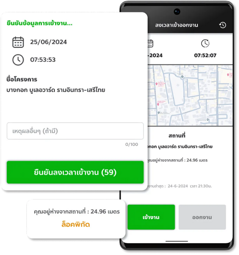 ลงเวลาเข้า-ออกงาน แบบ Real-Time มีการล็อคพิกัด (Location) ของแต่ละหน่วยงานในการลงเวลาเข้า-ออกงานมีการถ่ายภาพสดขณะลงเวลาเข้าและออกงาน และคลอบคลุมถึงการลืมลงเวลาหรือการย้ายหน่วยงานของเจ้าหน้าที่