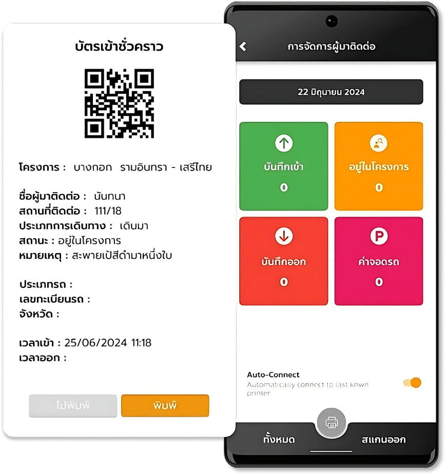 บันทึกผู้มาติดต่อแบบใช้งานง่าย รวดเร็ว ทั้งบันทึกเข้า, ปริ้นบัตรผ่านและแสกน QR CODE ขาออกรวมถึงสรุป